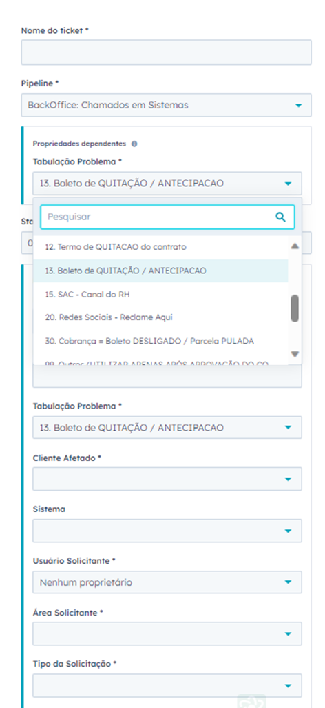 O agente deverá abrir um chamado interno (TICKET) no Pipe BackOffice: Chamados em Sistemas, o nome do ticket é o nome e o CPF do cliente. Em tabulação do problema o agente deve escolher a opção 13. Boleto de QUITAÇÃO / ANTECIPAÇÃO, direcionando o ticket para o setor correto. Em seguida é necessário descrever a solicitação no campo Descrição do ticket. Todos os campos que constam asterisco (*) é de preenchimento obrigatório.