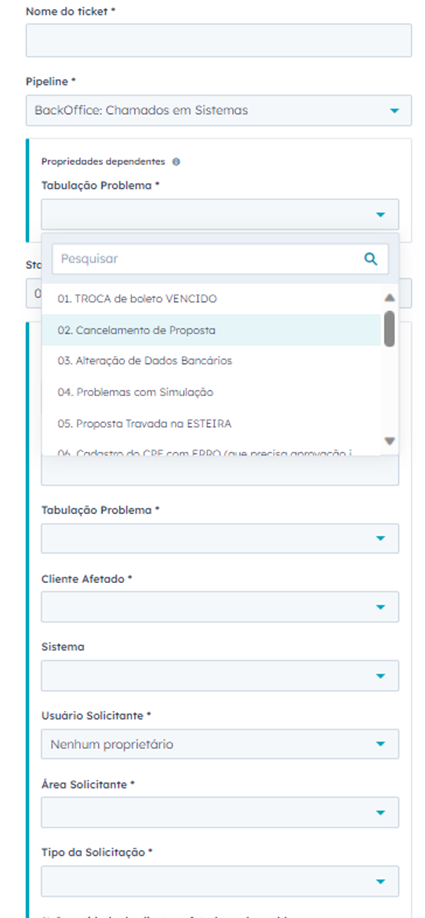 O agente deverá abrir um chamado interno (TICKET) no Pipe BackOffice: Chamados em Sistemas, o nome do ticket é o nome e o CPF do cliente. Em tabulação do problema o agente deve escolher a opção 02. Cancelamento de Proposta, direcionando o ticket para o setor correto. Em seguida será necessário descrever a solicitação no campo Descrição do ticket. Todos os campos que constam asterisco (*) é de preenchimento obrigatório.