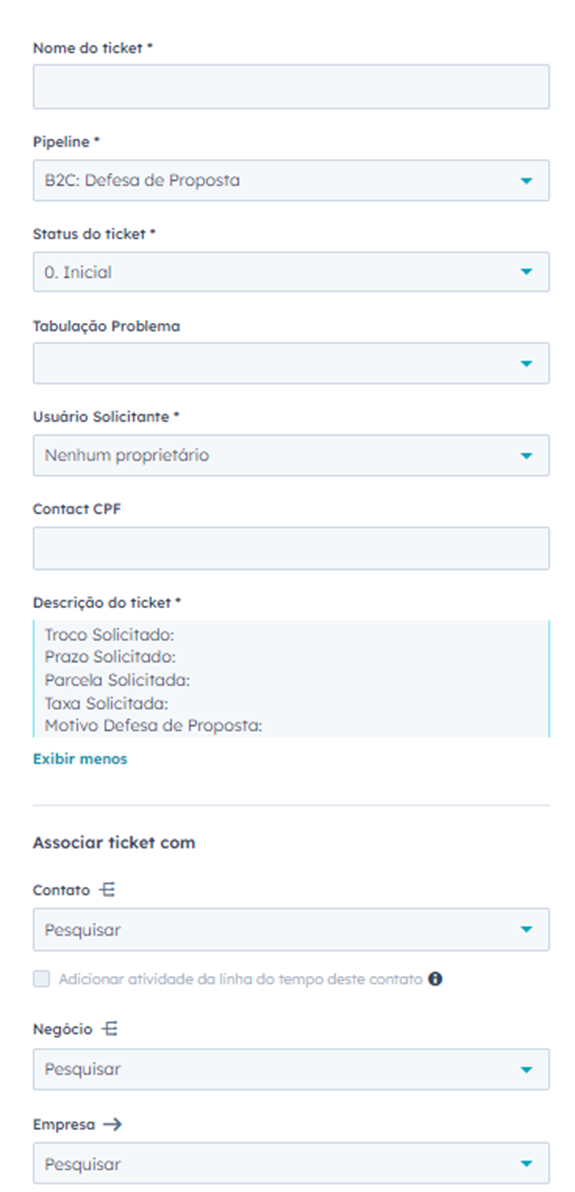 O agente deverá abrir um chamado interno (DEFESA DE PROPOSTA) no Pipe B2C: Defesa de proposta, o nome do ticket é o nome e o CPF do cliente. Em seguida é necessário descrever a solicitação no campo Descrição do ticket com as seguintes informações: