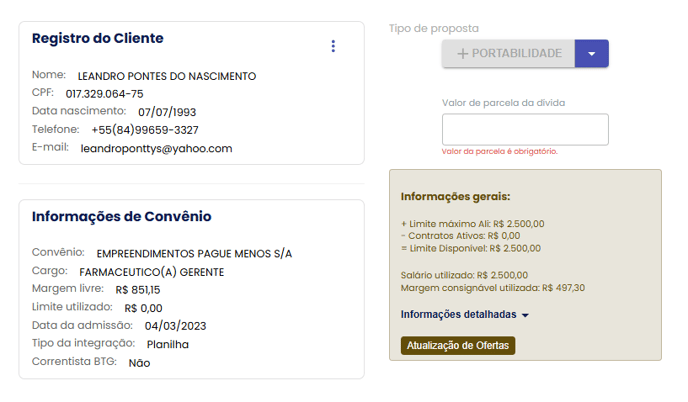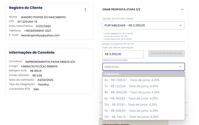 Após preencher as informações, o motor de crédito irá calcular o limite máximo disponível para o cliente para uma portabilidade.
