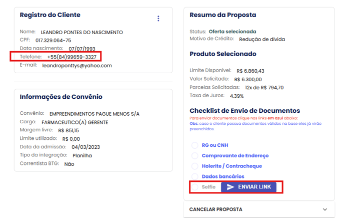 Ao terminar de anexar os documentos, devemos enviar ao cliente o link para validar a proposta com a selfie do seu rosto. Basta clicar em ENVIAR LINK que ele receberá em seu Whatssapp o passo-a-passo de como cloncluir a operação