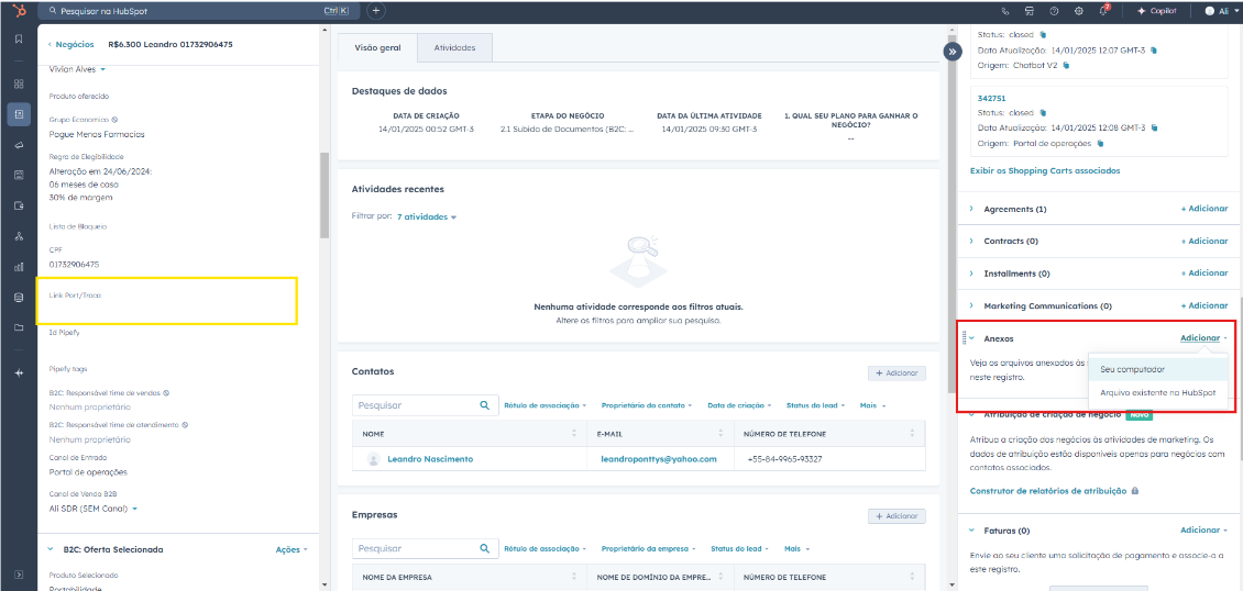 Após anexar os documentos o agente deve abrir a proposta no HubSpot, do lado direito procurar a opção anexo e anexar o boleto de quitação do consignado com a outra instituição conforme indicado pelo destaque em VERMELHO. Após concluir esse processo o anexo irá se tornar um link, o agente deve copiar esse link e colar no campo LINK/PORT destacado em AMARELO.