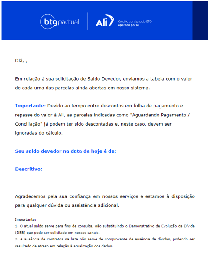 - Obrigado por aguardar [Nome do Cliente], o saldo devedor foi enviado ao seu e-mail. Pode verificar se chegou, por favor?
